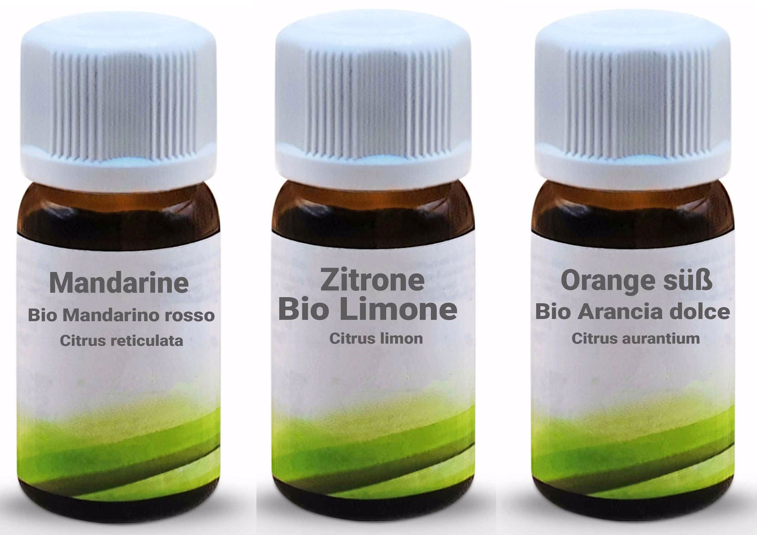 Trio Citrus: Premium-Set mit Bio-Ätherischen Ölen – Limone, Orange, Mandarine