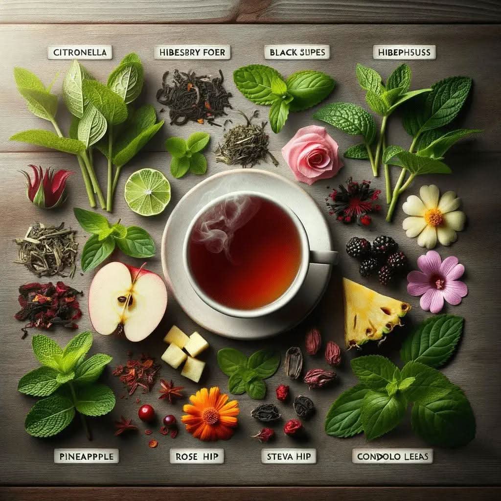 Lemongras*, grüne Minze*, Apfel*, Hibiskus*, Brombeerblätter*, Hagebutte*, Ananas*, Stevia*, Ringelblumen*, Kornblumen blau*.