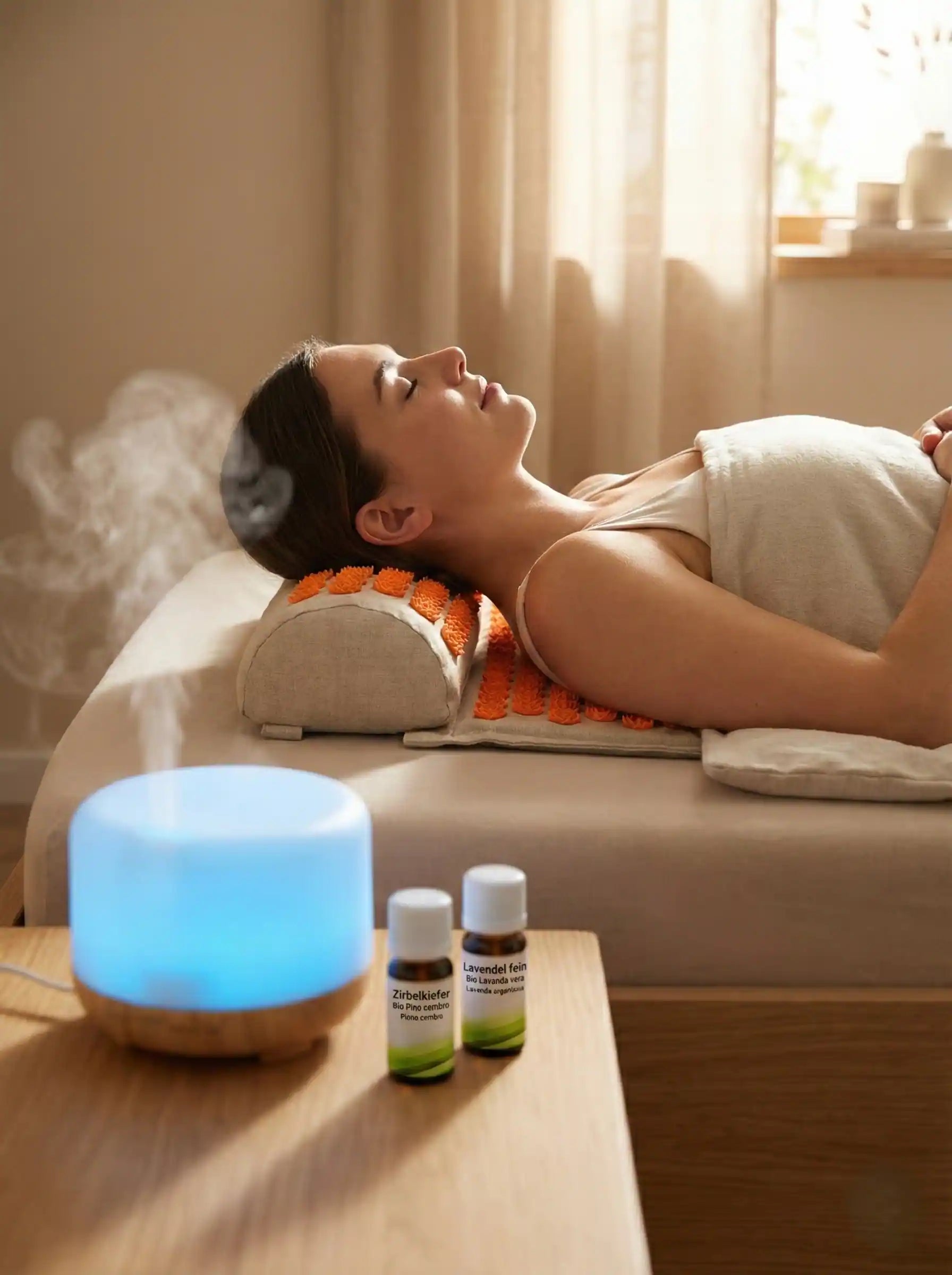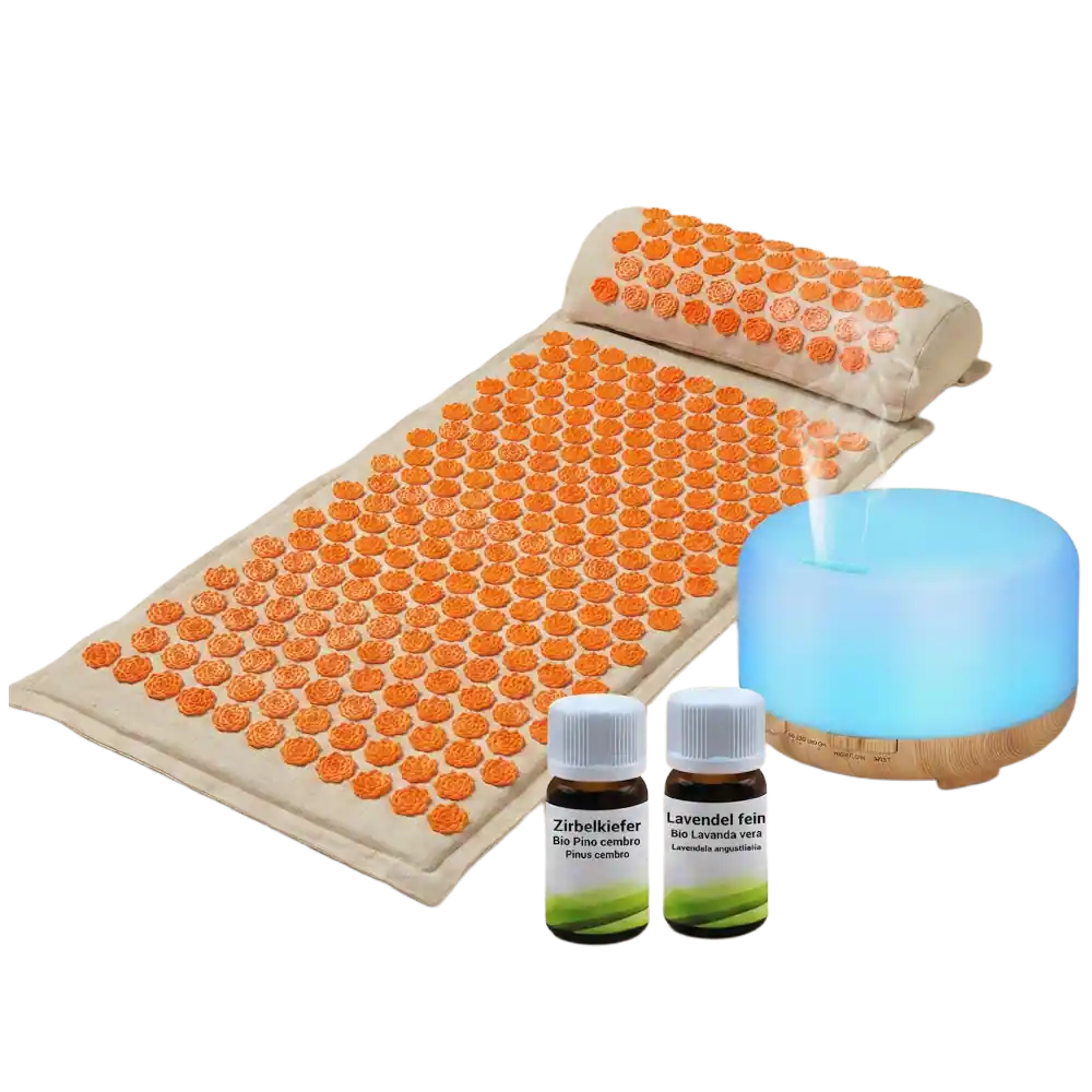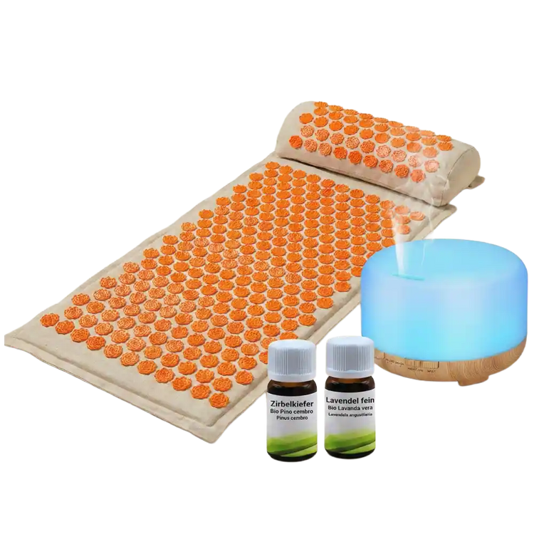 Tiefenentspannungs-Set Deluxe: Akupressurmatte + Diffuser & Bio-Öle