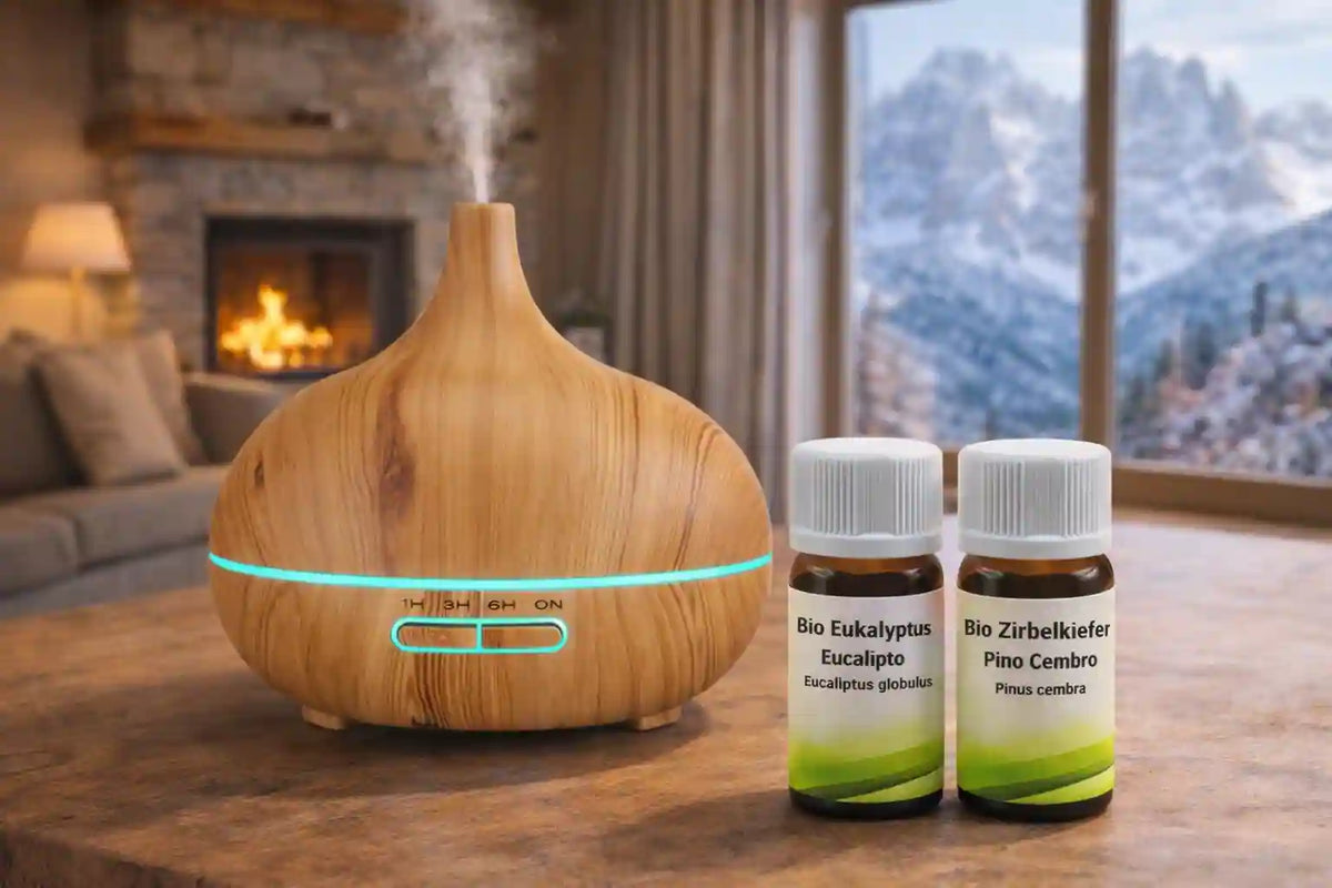 Zirbelkiefer für die Ruhe und Eukalyptus für die Frische – zwei Bio-Öle mit unserem Ultraschall-Diffusor (400ml). Das alpine Erlebnis für dein Zuhause, sofort einsatzbereit.
