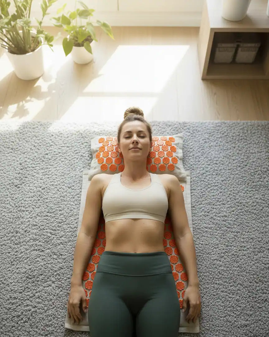 1. Der erste Moment: Legen Sie sich langsam auf die Matte. Die ersten 1-3 Minuten fühlen sich intensiv und "pieksig" an. Das ist normal! Atmen Sie ruhig und tief ein und aus.