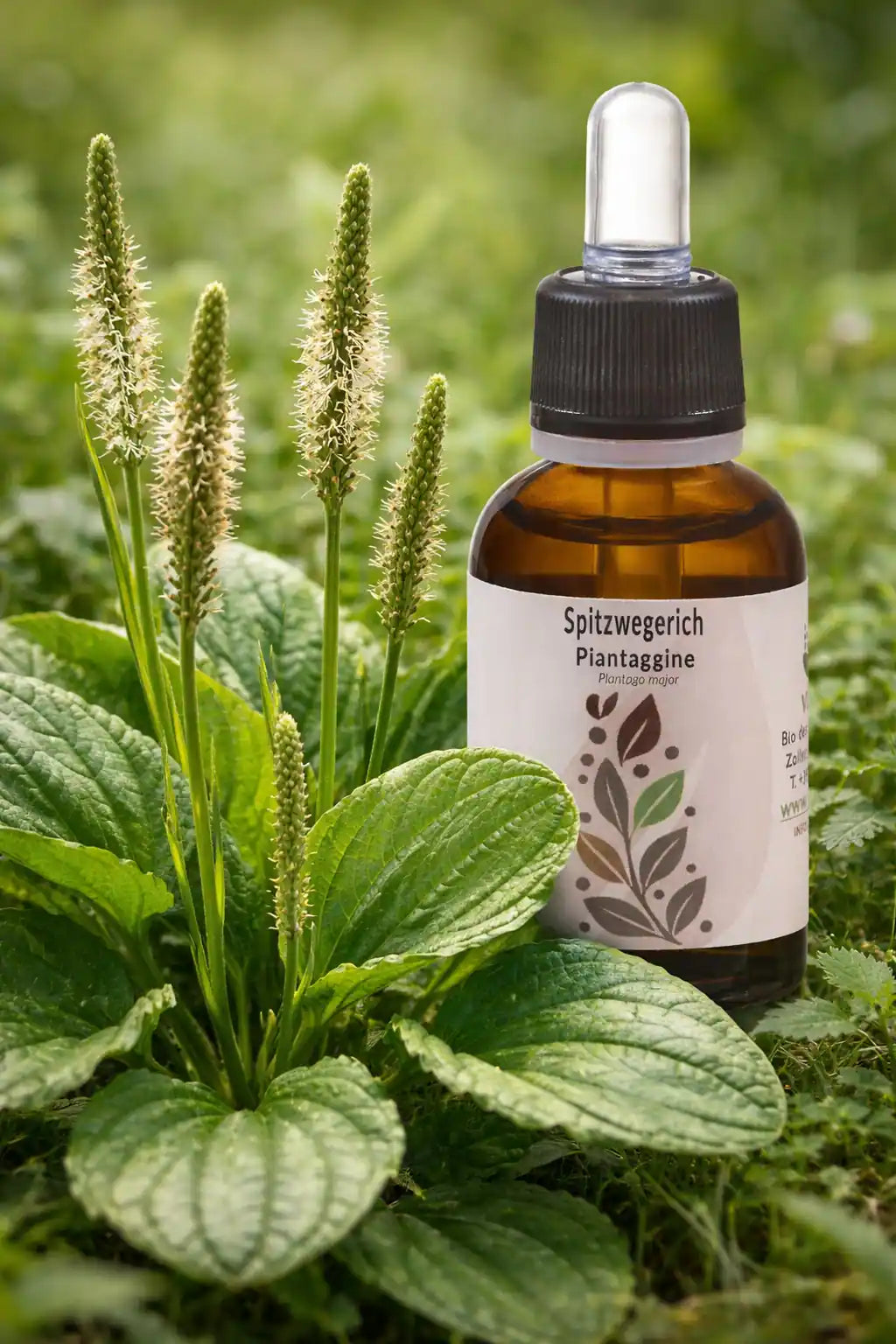 Hydroalcoholic extract from plantain leaves. Made in a specialised laboratory in Italy with a 1:1 extraction ratio.