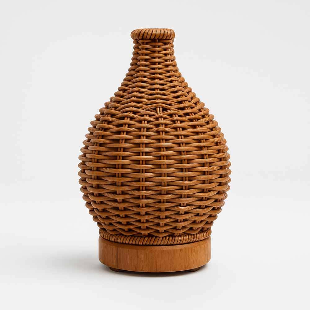 Mini diffusore a ultrasuoni da 100ml in design a vaso con dettagli in rattan. Compatto, decorativo e con 7 colori LED – perfetto per il comodino, la scrivania o ovunque serva un tocco di profumo e stile.